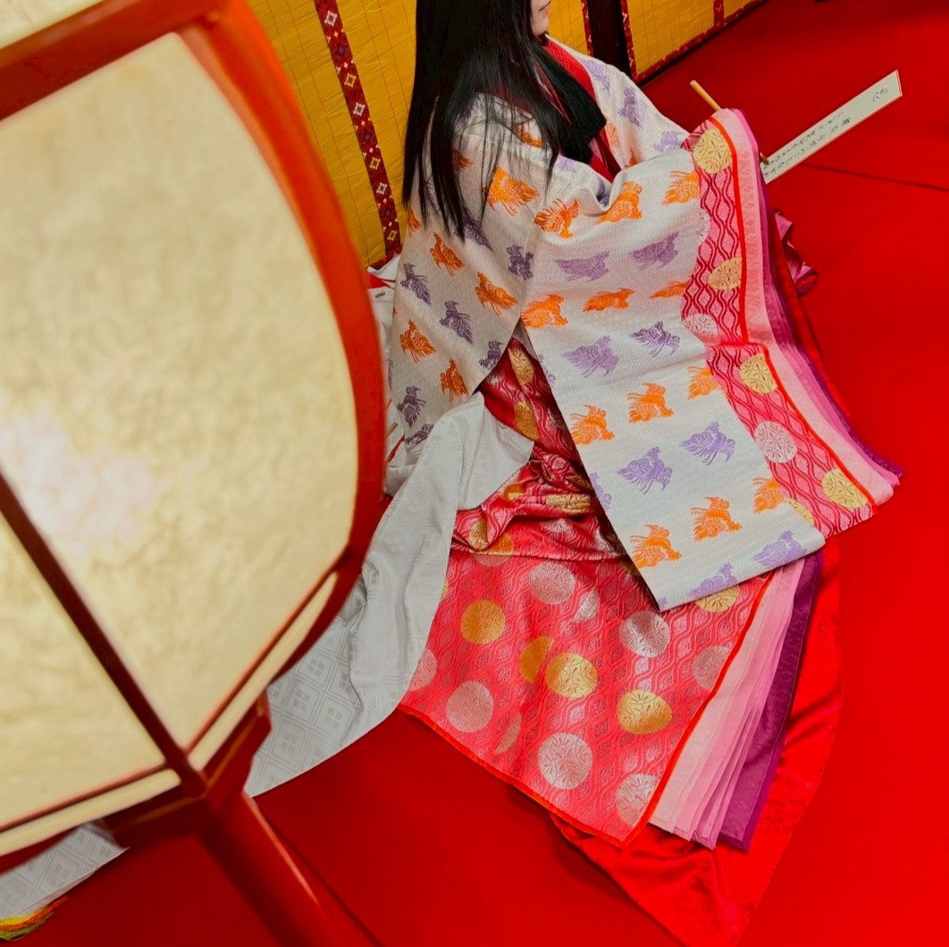 薄紅の袿に、紅梅の五つ衣を襲ね、