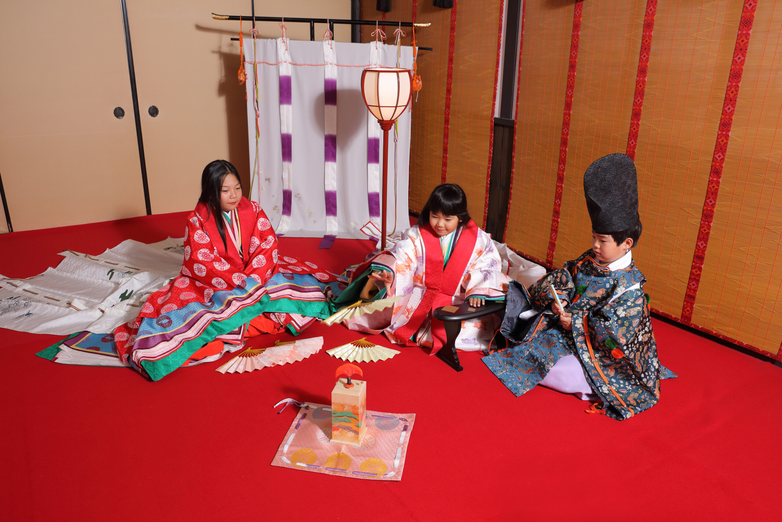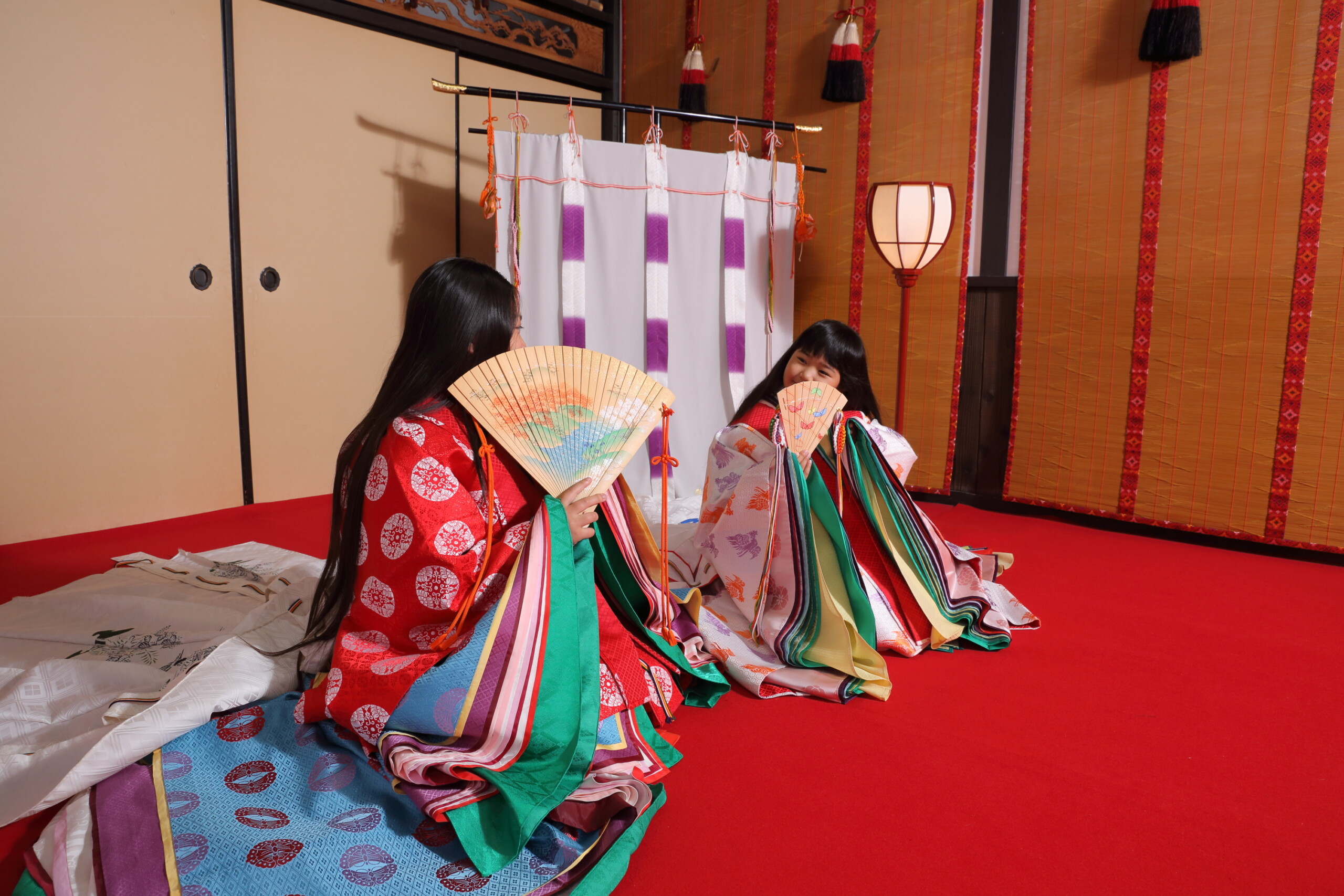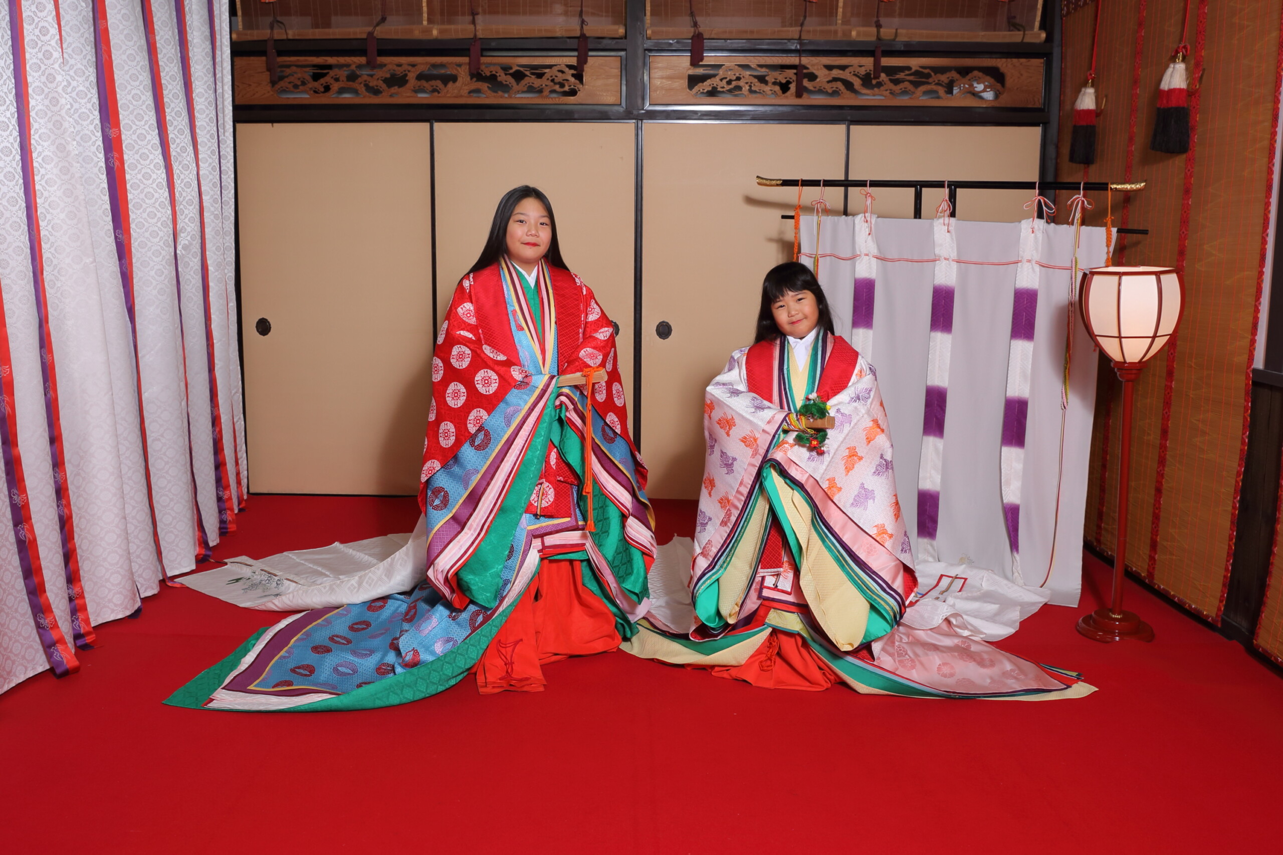 お姉ちゃんは赤と青で鮮やかな十二単を