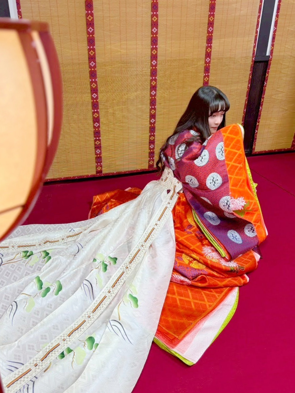 唐衣の文様のオレンジ色と
