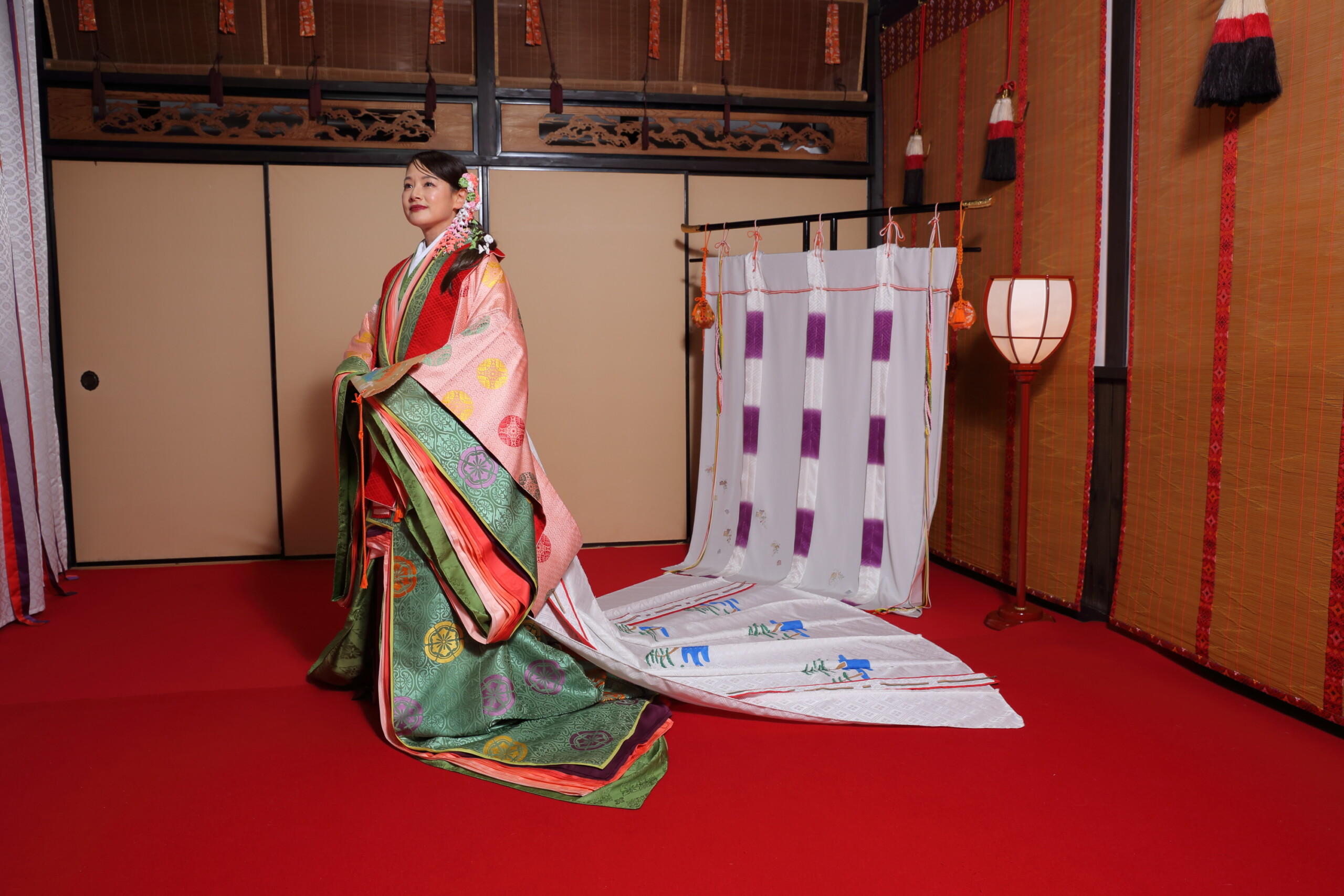 萌黄色と紅色の組み合わせの十二単をチョイスされました!
